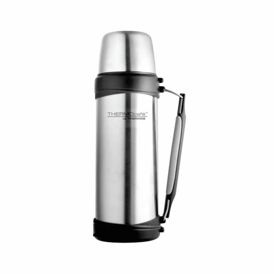 Termo de acero inoxidable. Doble pared con aislamiento al vacío. Mantiene caliente y frío. Tapón rosca. Manija retráctil. Correa desmontable. Capacidad 1 litro.