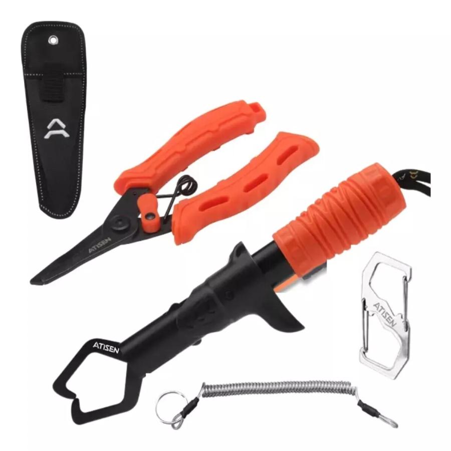 Pinza boga gripAlicate abridor de anzuelos, corta hilo con fundaMosquetón con cable elástico para no perder las pinzas